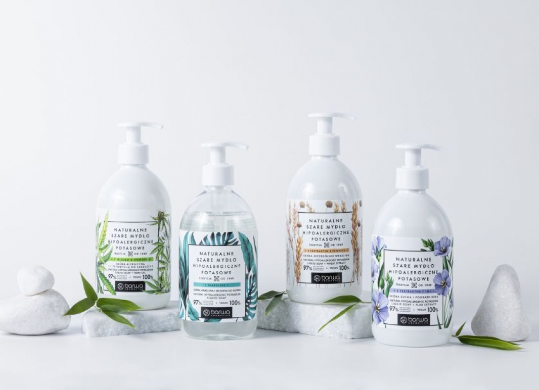 Mydło to absolutnie niezbędny produkt w każdej pielęgnacji. Jeśli mamy do czynienia ze skórą bardzo wrażliwą, suchą, skłonną do alergii, atopową lub z łuszczycą, najbezpieczniej będzie postawić na hipoalergiczne i wyjątkowo delikatne, ale sprawdzone receptury. Właśnie dlatego powstała linia Barwa Hipoalergiczna. To kompleksowa seria kosmetyków do pielęgnacji całego ciała. Wyróżnia ją wysoka zawartość składników naturalnych i łagodzących. Hipoalergiczna seria świetnie się sprawdza w pielęgnacji skóry suchej, wrażliwej i skłonnej do alergii – kosmetyki testowane są dermatologicznie, również pod kątem Atopowego Zapalenia Skóry. Aby zapewnić delikatne, a jednocześnie skuteczne oczyszczanie, linia została rozszerzona o Naturalne Szare Mydła Hipoalergiczne Potasowe w płynie o formułach minimalizujących wystąpienie alergii. Od dziesięcioleci stosowane przede wszystkim jako codzienny produkt do pielęgnacji dłoni i całego ciała. Świetnie oczyszczają, także włosy i skórę głowy. Przynoszą podrażnionej skórze ukojenie, zwalczając świąd i zaczerwienienia. Wykazuje także właściwości antybakteryjne, przez co wspomaga pielęgnację skóry trądzikowej. Łagodnie i bezpiecznie oczyszczają nawet najbardziej wrażliwą skórę, a zatem można z powodzeniem stosować je do przemywania ran oraz prania ubrań dla alergików. Będą doskonale się sprawdzać również jako produkty do higieny intymnej, ze względu na działanie przeciwgrzybiczne, odświeżające oraz przywracanie skórze jej właściwego pH. Są bezzapachowe, wegańskie, przebadane dermatologicznie na grupie osób z AZS i nie zawierają barwników