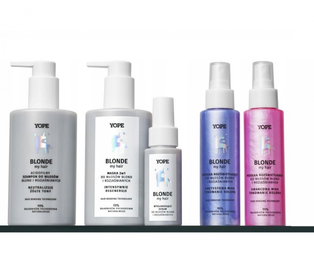 Blonde my Hair to nie tylko kosmetyki, to przede wszystkim filozofia dbania o zdrowie jasnych włosów. W świecie, w którym wiele z nas jest zabieganych i żyje w pośpiechu, YOPE stawia na łatwość i prostotę. Seria Blonde my Hair zachęca do celebrowania piękna włosów blond. Niezależnie od tego, czy jesteś naturalną blondynką, czy też wybierasz się na koloryzację – te produkty pozwolą Ci cieszyć się pięknem Twoich włosów oraz wydobyć ich blask. Dzięki innowacyjnej formule produktów – Hair Bonding Technology, włosy będą silne, wygładzone, odżywione i lśniące! Oprócz wyjątkowego działania, każdy z produktów kusi swoją konsystencją, która błyszczy i magicznie się mieni.