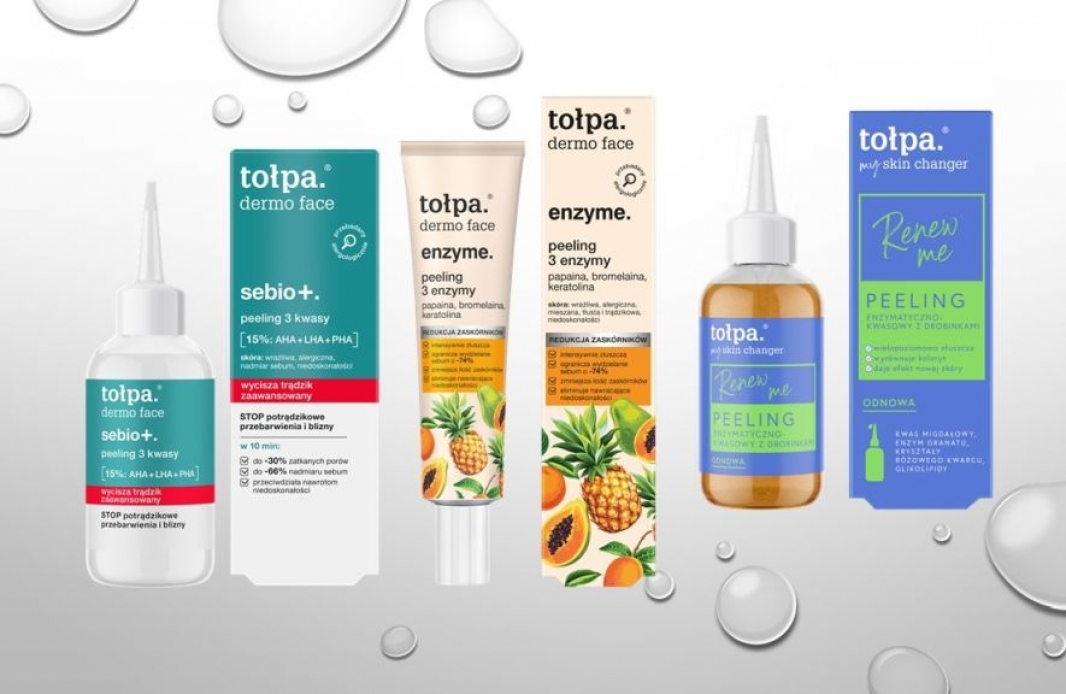 W laboratoriach tołpa. od wielu lat przygotowujemy formulacje peelingów dostosowane do potrzeb skóry twarzy, ciała oraz głowy. Naszym niekwestionowanym bestsellerem jest tołpa. dermo face enzyme peeling 3 enzymy. Pomimo że jest to peeling enzymatyczny, bez potrzeby mechanicznego tarcia, jego skuteczność potwierdzona w badaniach aparaturowych, jest doceniana również przez wymagających klientów. Owocowe enzymy, takie jak bromelaina z ananasa i papaina z papai, oraz mikrokapsułowana keratynaza, rozpuszczają martwy naskórek intensywniej niż drobinki mechaniczne, co sprawia, że może być stosowany również do skóry skłonnej do podrażnień.” – mówi Elżbieta Denes, Kierownik działu rozwoju formulacji Torf Corporation.
