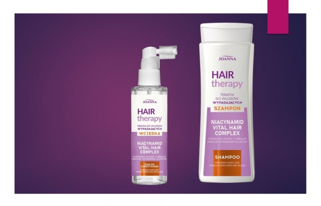Eksperci szacują, że zgodnie z naturalnym cyklem wzrostu, każdego dnia tracimy od 50 do 100 włosów dziennie. Problem pojawia się, kiedy ta średnia zostaje przekroczona. Tylko jak to policzyć? Prawda jest taka, że nadmiernego wypadania włosów nie da się nie zauważyć. Jeśli rano na poduszce zostaje coraz więcej kosmyków, garściami wyciągasz je ze szczotki, a w ciągu dnia znajdujesz na podłodze, to sygnał, że trzeba zadbać o wzmocnienie włosów, ponieważ problem z wypadaniem niezmiernie rzadko znika samoistnie. Do składników tradycyjnie stosowanych w takich sytuacjach zalicza się wzmacniające ekstrakty z czarnej rzeczy, skrzypu polnego i pokrzywy zwyczajnej. W szamponie i wcierce Hair Therapy marki Joanna dodatkowo znajduje się pantenol, który chroni osłabione włosy przed uszkodzeniami mechanicznymi i czynnikami zewnętrznymi oraz niacynamid stymulujący porost nowych włosów. Kluczowy jest jednak innowacyjny kompleks Vital Hair, który tworzą m.in. alfa-hydroksykwasy z trzciny cukrowej, cytryny i jabłka, które delikatnie złuszczając naskórek, torują drogę do mieszka włosowego innym substancjom aktywnym, takim jak silny antyoksydant, czyli ekstrakt z liści zielonej herbaty o właściwościach przeciwzapalnych, regeneracyjnych i kojących, który wzmacnia naczynia krwionośne i poprawia mikrocyrkulację. W skład kompleksu wchodzi także trimetylglicyna, pochodna aminokwasu naturalnie występującego w roślinach, która dostarcza cebulkom włosowym energii koniecznej do prawidłowego wzrostu włosów oraz hexapeptyd – jeden z najbezpieczniejszych, najlepiej przebadanych, silnie działających peptydów, pomagający w zakotwiczeniu cebulki włosowej w skórze głowy. Terapia składa się z dwóch etapów.