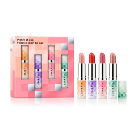 Plenty of Pop Makeup Set Clinique to zestaw czterech soczystych odcieni pomadek, które uwydatnią usta blaskiem. Clinique Pop™ to pomadki, które długo utrzymują się na ustach i nadają im bogaty, nasycony kolor z podkładem, tak aby zapewnić gładką aplikację i komfort noszenia.