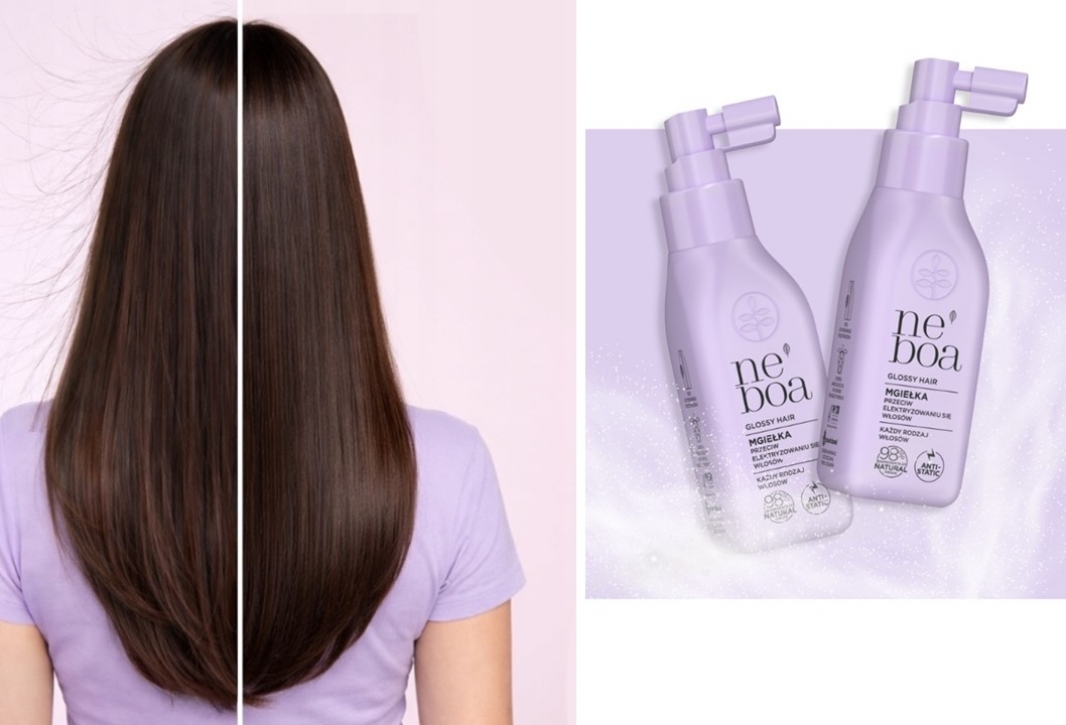 Mgiełka przeciw elektryzowaniu się włosów Glossy Hair od Neboa natychmiast wygładza pasma, niweluje elektryzowanie się i puszenie kosmyków, przywracając kontrolę nad włosami. Zawiera w składzie ekstrakt z czerwonych alg , który intensywnie nawilża, wzmacnia włosy i chroni je przed przesuszeniem spowodowanym mrozem oraz suchym powietrzem, a także ekstrakt z lnu, który sprawia, że pasma są bardziej podatne na stylizację. Efekt? Włosy są miękkie, gładkie, lśniące i zdyscyplinowane – nawet w środku zimy.