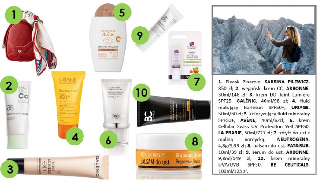 Sprawdź to: Wegański krem CC, Arbonne, 30ml/146 zł; krem DD Teint Lumière SPF25, Galénic, 40ml/98 zł; fluid matujący Bariésun SPF50+, URIAGE, 50ml/60 zł; koloryzujący fluid mineralny SPF50+, Eau Thermale Avène, 40ml/62zł; krem Cellular Swiss UV Protection Veil SPF50, La Prarie, 50ml/744 zł; krem mineralny UVA/UVB SPF50, Be Ceuticals, 100ml/ 123zł; sztyft do ust z maliną nordycką, Neutrogena, 4,8g/9,99 zł; balsam do ust, Pat&Rub, 10ml/39 zł; serum do ust 9,8ml/149 zł.