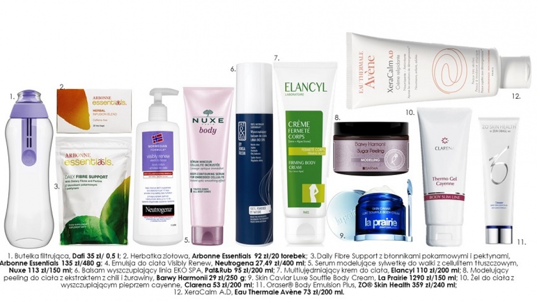 Sprawdź to: Emulsja do ciała Visibly Renew, Neutrogena 27,49 zł/400 ml; Serum modelujące sylwetkę do walki z cellulitem tłuszczowym, Nuxe 113 zł/150 ml; Balsam wyszczuplający linia EKO SPA, Pat&Rub 95 zł/200 ml; Modelujący peeling do ciała z ekstraktem z chili i żurawiny, Barwy Harmonii 29 zł/250 g; Skin Caviar Luxe Souffle Body Cream, La Prairie 1290 zł/150 ml; Żel do ciała z wyszczuplającym pieprzem cayenne, Clarena 53 zł/200 ml; Oraser Body Emulsion Plus, ZO Skin Health 359 zł/240 ml; Krem uzupełniający lipidy, XeraCalm A.D, Eau Thermale Avène 73 zł/200 ml.