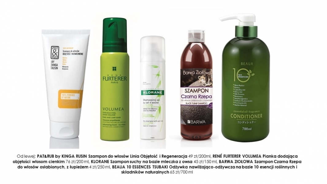 Sprawdź to: Pat&Rub by Kinga Rusin Szampon do włosów Linia Objętość i Regeneracja 49 zł/200ml, René Furterer Volumea Pianka dodająca objętości włosom cienkim 76 zł/200 ml, Klorane Szampon suchy na bazie mleczka z owsa 45 zł/150 ml.