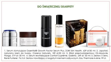 To mocno amerykański zwyczaj, coraz częściej kultywowany w polskich domach. Zaleta? Taka skarpeta jest w stanie pomieścić mnóstwo prezentów! Szukając pielęgnacyjnego prezentu anti-age postaw na skuteczny krem lub serum, które widocznie odmłodzi skórę. Serum stymulujące ZO Skin Health Ossentail Growth Factor Serum Plus ogranicza proces niszczenia kolagenu i elastyny, spłycając zarówno płytkie, jak i głębokie zmarszczki. Możesz wybrać też naturalny krem, który delikatnie, ale skutecznie odżywi skórę. Clarena Naturalis Japanese Rose Cream to wegański produkt 90-dniowy przywracający wrażliwej skórze równowagę. Jeśli osoba, którą obdarowujesz woli bardziej oleiste formuły do pielęgnacji, sięgnij po przeciwstarzeniowy eliksir Filorga Oil-Absolute lub ultra-nawilżające podwójne serum rewitalizujące Galénic Confort Suprême do przesuszonej skóry, na której występuje uczucie ściągnięcia. Nie jesteś najlepszą osobą w wybieraniu trafionych prezentów? Postaw na świąteczne zestawy marek do twarzy i ciała. Zestaw 5 SSENS marki René Furterer to upiększająca gama, która sprawdzi się przy wszystkich rodzajach włosów, a świąteczny zestaw nawilżający z bogatym kremem odżywczym od Eau Thermale Avène uzupełni niedobór lipidów i ochroni przed szkodliwymi czynnikami zewnętrznymi, nawet wrażliwą skórę.