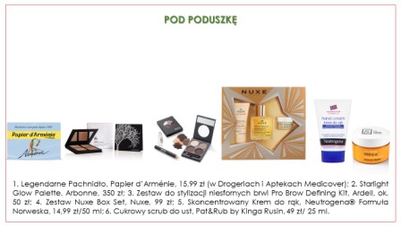 Niewygodną poduszkę jesteśmy w stanie przeboleć tylko, jeśli znajdziemy pod nią wymarzony prezent. Dla miłośników domowej atmosfery i świeżego zapachu w domu podaruj Legendarne Pachnidło Papier d’Armenie, które wypełni każdą przestrzeń pięknym zapachem. Jeśli z kolei masz do czynienia z „makijażowym freakiem”, zainwestuj w kolorówkę. Ostatnio bardzo modne jest rozświetalnie, czy podkreślenie brwi. W takim przypadku świetnie sprawdziłaby się kompozycja czterech pudrów rozświetlających Starlight Glow Palet od Arbonne, a także zestaw do stylizacji niesfornych brwi Pro Brow Defining Kit marki Ardell. Dowiedz się także jaką markę bliska Ci osoba lubi najbardziej – wiele z nich posiada specjalne świąteczne zestawy z największymi bestsellerami. Taką marką jest np. Nuxe ze swoim Nuxe Christmas Box Set, zawierającym gwiazdy z jego portfolio. Dla zapracowanych osób, szukających chwili odprężenia, podaruj relaksacyjny masaż w Sharley Medical Clinic & Day Spa. 60 minut profesjonalnego masażu, poprawi samopoczucie na zbliżający się okres karnawałowy. Dorzuć jeszcze coś, co uchroni przed zimowymi mrozami, a przy okazji pokaże drugiej osobie, jak bardzo się o nią troszczysz. Sięgnij po skoncentrowany krem do rąk marki Neutrogena® oraz cukrowy Scrub do ust Pat&Rub by Kinga Rusin, który uchroni zimą usta przed spierzchnięciem.