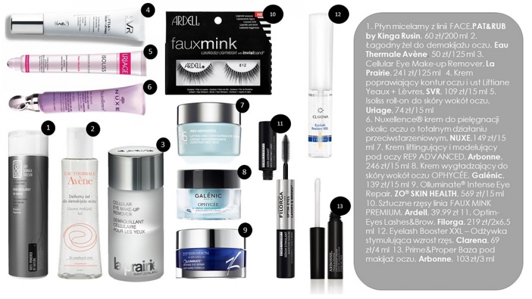 Spróbuj: Krem poprawiający kontur oczu i ust Liftiane Yeaux + Lèvres, SVR, 109 zł/15 ml, Isoliss roll-on do skóry wokół oczu, Uriage, 74 zł/15 ml, Nuxellence krem do pielęgnacji okolic oczu o totalnym działaniu przeciwstarzeniowym, Nuxe,149 zł/15 ml, Krem liftingujący i modelujący pod oczy RE9 Advanced, Arbonne. 246 zł/15 ml, Krem wygładzający do skóry wokół oczu Ophycée, Galénic, 139 zł/15 ml, Olluminate Intense Eye Repair, ZO Skin Health, 569 zł/15 ml, Light Eyes mezoterapia pod oczy, Sharley Medical Clinic & Day Spa Magda Bogulak, cena: od 600 zł.