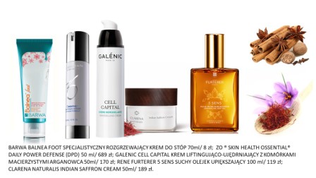 Barwa Balnea Foot specjalistyczny rozgrzewający krem do stóp 70ml/ 8 zł; ZO Skin Health Ossential Daily Power Defense (DPD) 50 ml/ 689 zł; Galenic Cell Capital krem liftingująco-ujędrniający z komórkami macierzystymi arganowca 50ml/ 170 zł; Rene Furterer 5 Sens suchy olejek upiększający 100 ml/ 119 zł; Clarena Naturalis Indian Saffron Cream 50ml/ 189 zł.