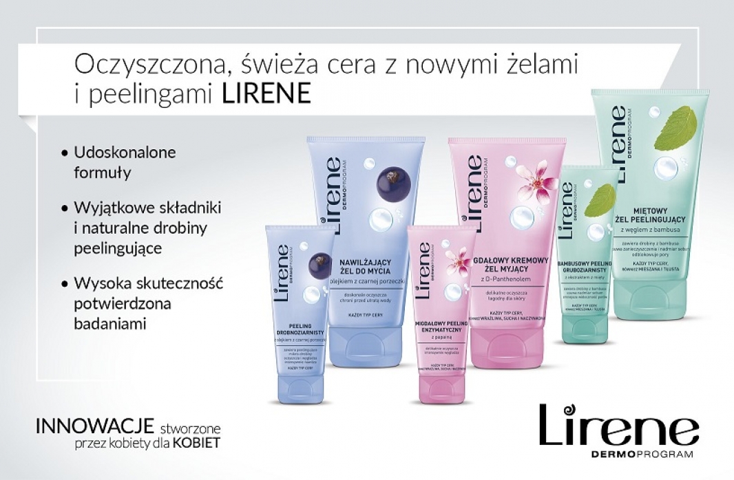 Codzienny tryb życia, środowisko, zanieczyszczenia, dieta, a przede wszystkim pielęgnacja mają wpływ na nasze zdrowie, samopoczucie, a także wygląd i kondycję skóry. I chociaż ze stanem powietrza w niewielkim stopniu możemy walczyć, to odpowiednia pielęgnacja jest w zasięgu ręki. Jej podstawą jest właściwe oczyszczanie, które nie tylko utrzymuje skórę w dobrej kondycji, ale również przyczynia się do jej młodego i promiennego wyglądu. Dlatego Ekspertki Laboratorium Naukowego Lirene opracowały nowe receptury żeli myjących i peelingów wykorzystujące wyselekcjonowane składniki pielęgnacyjne oraz naturalne drobiny złuszczające. Dzięki temu kosmetyki Lirene kompleksowo oczyszczają skórę z makijażu i zanieczyszczeń, głęboko nawilżają i wygładzają.