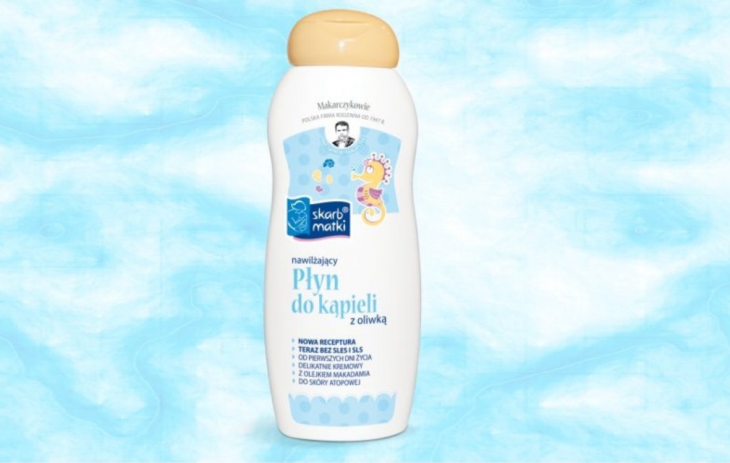 Idealnym płynem do kąpieli dla noworodków wolnym od składników drażniących i niebezpiecznych dla skóry naszych najmłodszych jest Nawilżający płyn do kąpieli z oliwką marki Skarb Matki (pojemność 250 ml, cena 18 zł). Teraz jeszcze lepszy i bardziej delikatny! Płyn dokładnie oczyszcza skórę, a dzięki udoskonalonemu składowi, naskórek jest wspaniale nawilżony, miękki i gładki. To zasługa zawartości oliwy z oliwek oraz orzechów makadamia. Olej z tych orzechów regeneruje skórę, odbudowuje warstwę lipidową naskórka i przeciwdziała utracie wody. Intensywnie nawilża, uelastycznia, zmiękcza oraz wygładza. Wyciąg z rumianku natomiast łagodzi i pielęgnuje delikatną skórę noworodków. Teraz Płyn do kąpieli z oliwką może być stosowany już od pierwszych dnia życia, nawet jeśli maluszek ma skłonność do alergii i AZS. Płyn ma konsystencję kremowej emulsji emolientów, nie zawiera SLS i SLES.