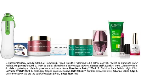 Wypróbuj: Butelka filtrująca, Dafi 35 zł/0,5 l; 2. Peeling do ciała Shea Sugar Peeling, Indigo 69zł/ 500ml; Krem do ciała z ekstraktem z odżywczego kawioru, Clarena 51zł/ 200ml; Ultra Luksusowy krem do ciała o globalnym działaniu przeciwstarzeniowym Nuxuriance, Nuxe 240zł/ 200ml; Platinium Rare Cellular Night Elixir, La Prairie 4712zł/ 20ml; Tonizujący żel pod prysznic, Elancyl 40zł/ 200ml; Szminka Smoothed Over, Arbonne 102zł/ 4,9g; Lakier hybrydowy We are the colors by Natalia Siwiec, Indigo 33zł/ 7ml;.