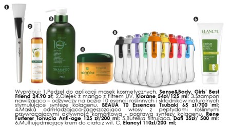 Wypróbuj: Olejek z mango z filtrem UV, Klorane 54zł/125 ml; Szampon nawilżająco – odżywczy na bazie 10 esencji roślinnych i składników naturalnych stymulujące syntezę kolagenu, BEAUA 10 Essences Tsubaki 65 zł/700 ml; Maska odmładzająca-zagęszczająca włosy z peptydami roślinnymi przywracającymi aktywność komórkową - poprawa syntezy kolagenu, Rene Furterer Tonucia Anti-age 125 zł/200 ml; Butelka filtrująca, Dafi 35zł/ 500 ml; Multiujędrniający krem do ciała z wit. C, Elancyl 110zł/200 ml.