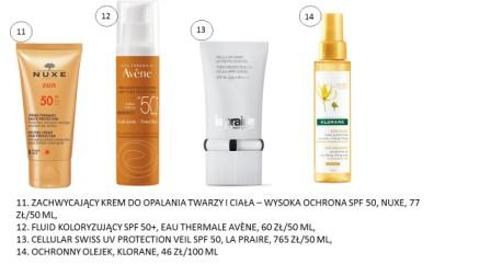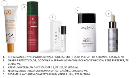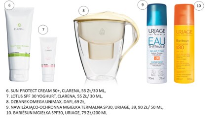Wypróbuj: 1. RE9 Advanced Prepwork, kryjący podkład Soft Focus Veil spf 30, Arbonne, 185 zł/30 ml; 2. Okara Protect Color, odżywka w sprayu wzmacniająca kolor włosów, Rene Furterer, 76 zł/150 ml; 3. Pause krem uniwersalny przeciwzmarszczkowy Only You spf 15, Barwa, 90zł/50ml; 4. Niewidzialna tarcza ochronna spf 50, Galénic, 159zł/ 40ml; 5. Ekoampułka 2 anti-aging przeciwstarzeniowa I regenerująca, Pa&Rub by Kinga Rusin, 179zł/30ml; 6. Sun Protect Cream 50+ do skóry wrażliwej, naczyniowej i po zabiegach laserowych, Clarena 55zł/30ml; 7. Lotus spf 30 Yoghurt, krem łagodzący po zabiegach kosmetycznych, Clarena 55zł/30ml; 8. Nawilżająco-ochronna mgiełka termalna spf 30, Uriage, 39,90zł/50ml; 9. Bariésun mgiełka spf 30 z efektem „suchego dotyku”, Uriage, 79zł/ 200ml; 10. Dzbanek omega unimax, Dafi, 69zł; 11. Zachwycający krem do opalania twarzy i ciała – wysoka ochrona spf 50, Nuxe, 77zł/50 ml; 12. Fluid koloryzujący spf 50+, Eau Thermale Avène, 60zł/50 ml, 13. Cellular Swiss UV Protection Veil spf 50, La Praire, 765zł/50 ml; 14. Ochronny olejek, Klorane, 46zł/100 ml;