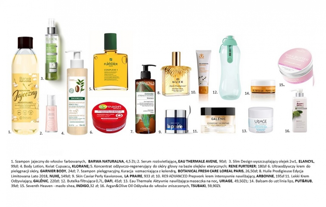Rekomendowane produkty z witaminami i minerałami, na bazie naturalnych składników: Szampon jajeczny do włosów farbowanych, Barwa Naturalna, 4,5 ZŁ; Serum rozświetlające, Eau Thermale Avène, 90zł; Slim Design wyszczuplający olejek 2w1, Elancyl, 99zł; Body Lotion, Kwiat Cupuacu, Klorane; Koncentrat odżywczo-regenerujący do skóry głowy na bazie olejków eterycznych, René Furterer180zł Ultraodżywczy krem do pielęgnacji skóry, Garnier BODY, 24zł; Szampon pielęgnacyjny, Kuracja wzmacniająca z kolendrą, Botanical Fresh Care Loreal Paris, 26,50zł