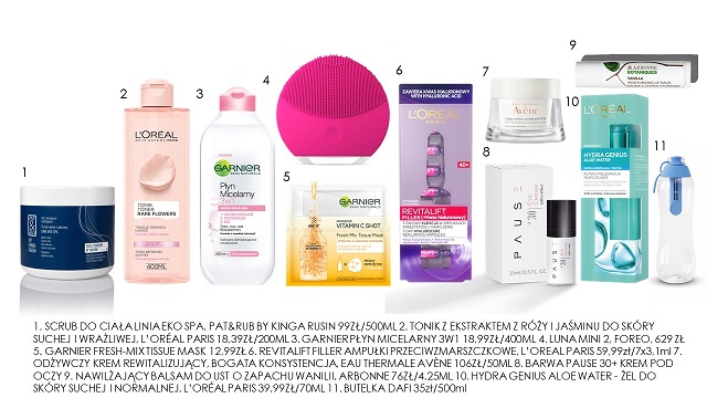 Przyda się: 1. Scrub Do Ciała Linia Eko Spa, Pat&Rub By Kinga Rusin 99zł/500ml 2. Tonik Z Ekstraktem Z Róży I Jaśminu Do Skóry Suchej I Wrażliwej, L’oréal Paris 18,39zł/200ml 3. Garnier Płyn Micelarny 3w1 18,99zł/400ml 4. Luna Mini 2, Foreo, 629 Zł 5. Garnier Fresh-Mix Tissue Mask 12,99zł 6. Revitalift Filler Ampułki Przeciwzmarszczkowe, L’oreal Paris 59,99zł/7x3,1ml 7. Odżywczy Krem Rewitalizujący, Bogata Konsystencja, Eau Thermale Avène 106zł/50ml 8. Barwa Pause 30+ Krem Pod Oczy 9. Nawilżający Balsam Do Ust O Zapachu Wanilii, Arbonne 76zł/4,25ml 10. Hydra Genius Aloe Water - Żel Do Skóry Suchej I Normalnej, L’oréal Paris 39,99zł/70ml 11. Butelka Dafi 35zł/500ml.