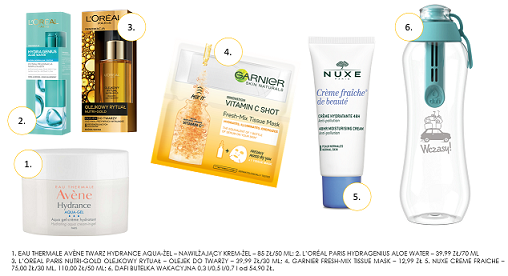 Sprawdź: 1. Eau Thermale Avène Twarz Hydrance Aqua-Żel – Nawilżający Krem-Żel – 85 Zł/50 Ml; 2. L’oréal Paris Hydragenius Aloe Water – 39,99 Zł/70 Ml; 3. L’oréal Paris Nutri-Gold Olejkowy Rytuał - Olejek Do Twarzy – 39,99 Zł/30 Ml; 4. Garnier Fresh-Mix Tissue Mask – 12,99 Zł; 5. Nuxe Creme Fraiche – 75,00 Zł/30 Ml, 110,00 Zł/50 Ml; 6. Dafi Butelka Wakacyjna 0,3l/0,5l/0,7l Od 54,90 Zł.