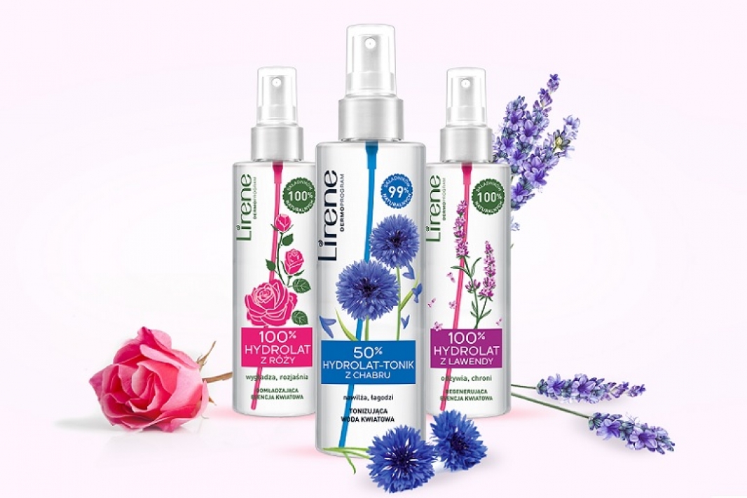 Ich moc doceniły Ekspertki Laboratorium Naukowe Lirene, tworząc receptury trzech nowych kosmetyków: 100% hydrolatu z róży, 100% hydrolatu z lawendy oraz 50% hydrolatu – toniku z chabru. Kosmetyki długotrwale nawilżają, odświeżają oraz wygładzają cerę.