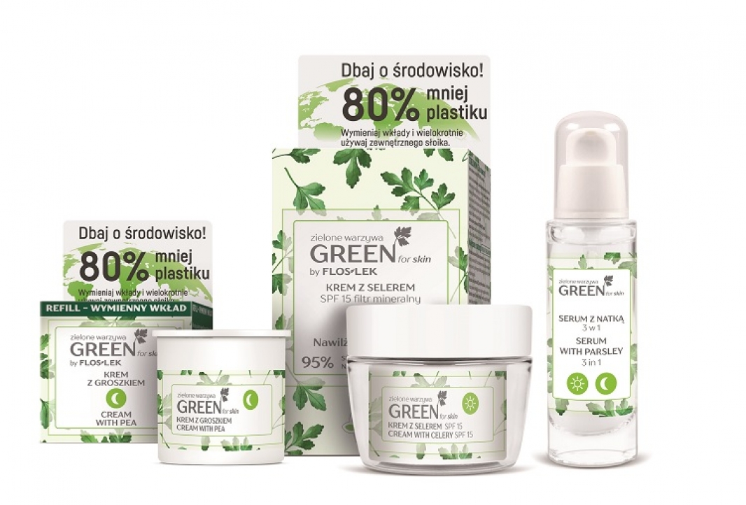 Ekstrakty z zielonych warzyw: selera, groszku zielonego, natki pietruszki i ogórka o nawilżającym i kondycjonującym działaniu to dar witalnych sił płynących z natury. Teraz możesz je podarować swojej skórze w postaci lekkich, ale niezwykle bogatych w składniki odżywcze kremów. Po raz kolejny Laboratorium Kosmetyczne Floslek sięga po to, co najlepsze: składniki pochodzenia naturalnego. Zdrowe i sprawdzone, które pokocha każda kobieta. Green for skin to produkty wegańskie, niezawierające składników pochodzenia zwierzęcego, a wymienne wkłady Refill to 80% mniej plastiku i oszczędność dla portfela! Wybierając Green for skin dbasz zarówno o swoją skórę, jak i nasza planetę!