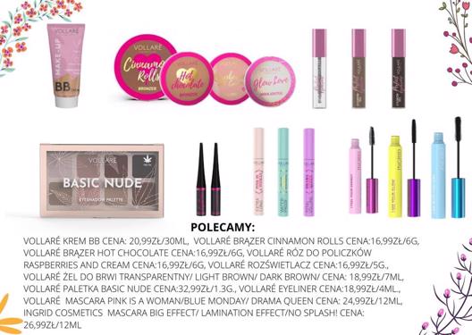 Polecamy: Vollarécosmetics Krem Bb Cena: 20,99zł/30ml.; Vollarécosmetics Róz Do Policzków Raspberries And Cream Cena:16,99zł/6g., Vollarécosmetics Brązer Hot Chocolate Cena:16,99zł/6g., Vollarécosmetics Rozświetlacz Cena:16,99zł/5g., Vollarécosmetics Żel Do Brwi Dark Brown/ Light Brown/ Transparentny Cena: 18,99zł/7ml., Vollarécosmetics Paletka Basic Nude Cena:32,99zł/1.3g., Vollarécosmetics Eyeliner Cena:18,99zł/4ml., Vollarécosmetics Mascara Drama Queen/Blue Monday/ Pink Is A Woman Cena: 24,99zł/12ml., Ingrid Cosmetics Tusze Do Rzęs No Splash/Lamination Effect/Big Effect Cena:26,99zł/12ml.