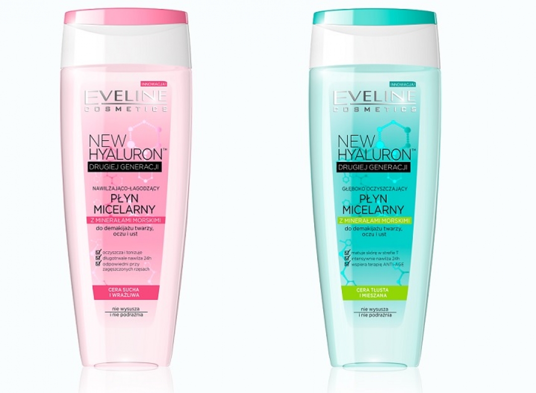 Nawilżająco - Łagodzący płyn micelarny New Hyaluron™ Drugiej Generacji Eveline Cosmetics - do demakijażu twarzy, oczu i ust - cera sucha i wrażliwa.