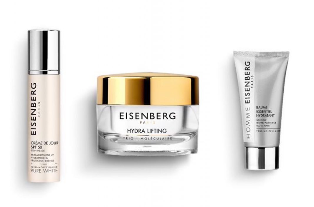 Produkty do pielęgnacji skóry Eisenberg Paris, to przede wszystkim długi proces badań i pracy nad nimi, aby zapewnić najlepsze rezultaty i sprostać najbardziej wymagającym skórom. Łącząc najnowsze osiągnięcia nauki ze składnikami aktywnymi pochodzącymi z natury, wykwalifikowany zespół specjalistów bada i opracowuje rozwiązania, które zapewniają najwyższy poziom jakości i skuteczności. W takich warunkach powstała formuła trio-moléculaire, która stanowi serce całej linii kosmetyków Eisenberg i zawiera 3 aktywne molekuły, które wspierają regenerację, stymulują i dotleniają skórę. Poza tym produkty nawilżające zawierają specjalnie wyselekcjonowane składniki takie jak kwas hialuronowy, który intensywnie nawilża, wyciąg z wysłodzin z ziaren jęczmienia, który ogranicza utratę wody z warstw naskórka oraz mikrokapsułki witamin C i E, które przeciwdziałają wysuszaniu i starzeniu się skóry, pobudzają syntezę kolagenu oraz neutralizują wolne rodniki.