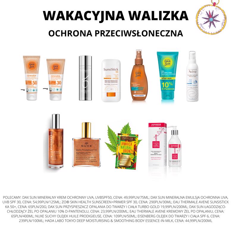 Polecamy: Dax Sun Mineralny Krem Ochronny Uva, Uvb Spf50, Cena: 49,99pln/75ml; Dax Sun Mineralna Emulsja Ochronna Uva, Uvb Spf 30, Cena: 54,99pln/125ml; Zo® Skin Health Sunscreen+Primer Spf 30, Cena: 290pln/30ml; Eau Thermale Avene Sunsistick Ka 50+, Cena: 65pln/20g; Dax Sun Przyspieszacz Opalania Do Twarzy I Ciała Turbo Gold 19,99pln/200ml; Dax Sun Łagodząco-Chłodzący Żel Po Opalaniu 10% D-Pantenolu, Cena: 23,99pln/200ml; Eau Thermale Avene Kremowy Żel Po Opalaniu, Cena: 65pln/400ml; Nuxe Suchy Olejek Huile Prodigieuse, Cena: 109pln/50ml; Eisenberg Olejek Do Twarzy I Ciała Spf 6, Cena: 239pln/100ml; Hada Labo Tokyo Deep Moisturising & Smoothing Body Essence-In-Milk, Cena: 44,99pln/200ml.
