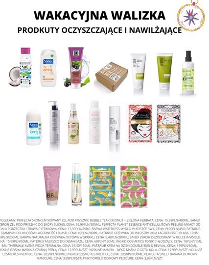 Polecamy: Perfecta Skoncentrowany Żel Pod Prysznic Bubble Tea Coconut + Zielona Herbata, Cena: 15,99pln/400ml; Sanex Zero% Żel Pod Prysznic Do Skóry Suchej, Cena: 16,99pln/500ml; Perfecta Planet Essence Antycellulitowy Peeling Myjący Do Ciała Porzeczka I Trawa Cytrynowa, Cena: 13,99pln/250g; Barwa Waterless Mydło W Kostce 3w1, Cena:19,90pln/45g; Pat&Rub Szampon Do Włosów Łagodność I Blask, Cena: 49pln/200ml; Pat&Rub Odżywka Do Włosów Linia Łagodność I Blask, Cena: 59pln/200ml; Barwa Naturalna Odżywka Octowa W Sprayu, Cena: 9,49pln/200ml; Sanex Zero% Dezodorant W Kulce Invisible, Cena: 15,99pln/50ml; Pat&Rub Mleczko Do Demakijażu, Cena: 60pln/180ml; Ingrid Cosmetics Tonik Chłodzący, Cena: 18pln/75ml; Eau Thermale Avene Woda Termalna, Cena: 37,40/150ml; Pat&Rub Krem Na Dzień Double Skin & Revival, Cena: 159pln/50ml; Yoskine Geisha Maska Z Czarną Perłą, Cena: 12,99pln/Szt; Yoskine Maneki – Neko Maska Z Gotu Kola, Cena: 12,99pln/Szt; Vollaré Cosmetics Krem Bb, Cena: 20,99pln/30ml; Ingrid Cosmetics Krem Cc, Cena: 38,99pln/30ml; Perfecta Sweet Banana Domowy Manicure, Cena: 3,99pln/Szt; Pink Pomelo Domowy Pedicure, Cena: 3,99pln/Szt.