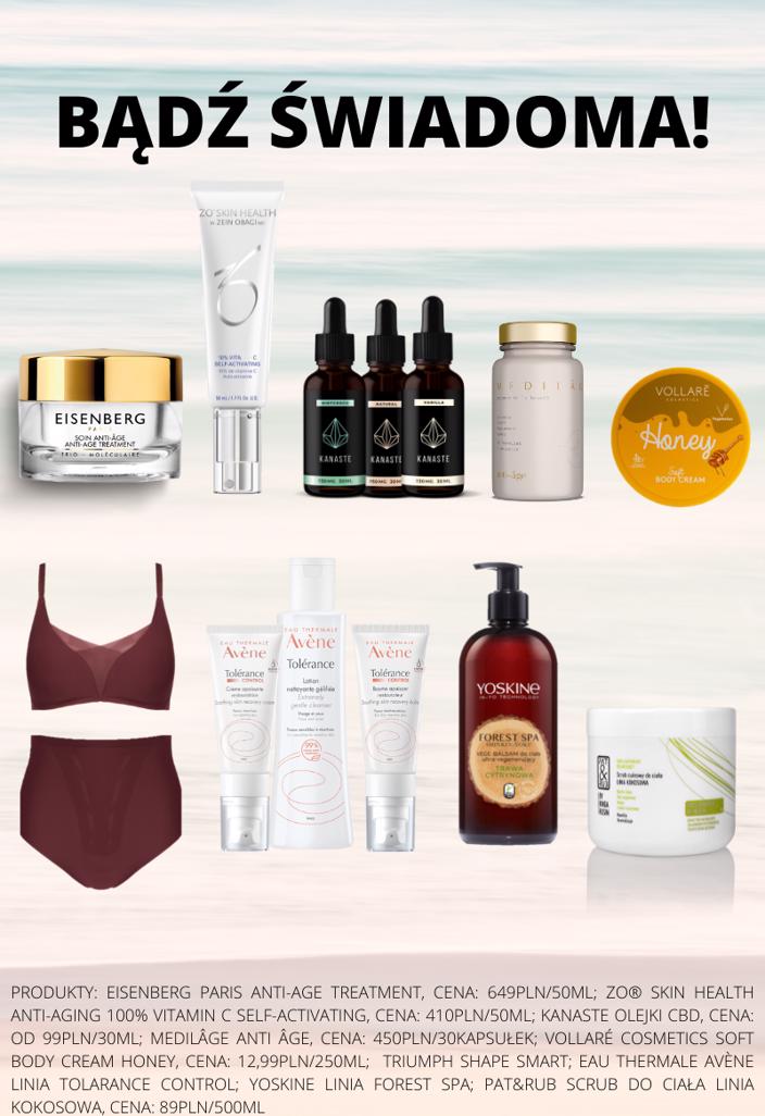 Produkty: Eisenberg Paris Anti-Age Treatment, Cena: 649pln/50ml; ZO Skin Health Anti-Aging 100% Vitamin C Self-Activating, Cena: 410pln/50ml; Kanaste Olejki Cbd, Cena: Od 99pln/30ml; Medilâge Anti Âge, Cena: 450pln/30kapsułek; Triumph Shape Smart; Vollare Cosmetics Soft Body Cream Honey; Eau Thermale Avène Linia Tolarance Control; Yoskine Linia Forest Spa; Pat&Rub Scrub Do Ciała Linia Kokosowa, Cena: 89pln/500ml.