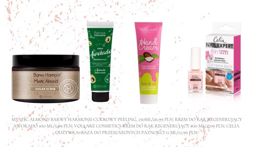 Od zawsze wiadomo, że lepiej zapobiegać niż leczyć, dlatego najlepszym sposobem na przywrócenie dłoniom pięknego wyglądu zimną jest używanie przynajmniej raz w tygodniu peelingu. Najlepiej sięgnąć po ten do ciała, np. cukrowy peeling Mystic Almond Barwy Harmonii. Wzbogacony o olej ze słodkich migdałów, błyskawicznie eliminuje szorstkość, intensywnie ujędrnia i wygładza skórę. Dzięki recepturze opartej na unikalnej kompozycji masła shea, oleju kokosowego i kompleksu witamin skóra otrzymuje potężną dawkę naturalnych składników odżywczych i antyoksydantów.