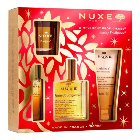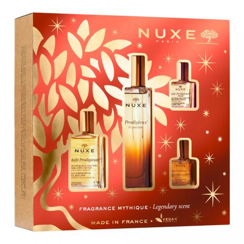 Odkryj zniewalający zapach perfum Prodigieux, które wraz z trzema wersjami olejku Huile Prodigieuse tworzą ten niezwykły zestaw prezentowy.
