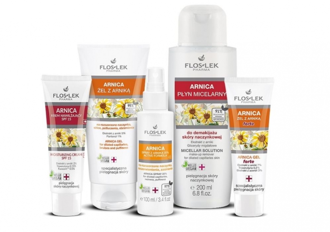 Zanim zastosujesz krem, na twarz nałóż Arnica Żel z arniką na rozszerzone naczynka, sińce, potłuczenia, obrzmienia (cena 27,99 zł/pojemność 200 ml). Zawarty w nim ekstrakt z arniki obkurcza drobne naczynka, zmniejsza ich widoczność, delikatnie chłodzi, działa kojąco i łagodząco. Żel arnikowy można również aplikować na części ciała, gdzie powstały mikrourazy, stłuczenia czy zasinienia. Żel przyspiesza regenerację i obkurczanie naczynek oraz wchłanianie siniaków np. po zwichnięciach, stłuczeniach. Dobrze się wchłania.