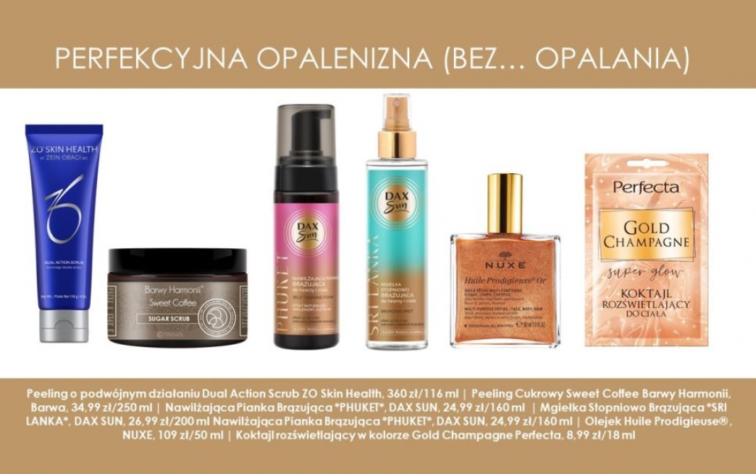 Odpowiednie złuszczenie to wstęp do uzyskania pięknej i równomiernej opalenizny z tubki. Szorstkie, martwe komórki skóry powodują powstawanie plam. Peeling twarzy i ciała (skup się szczególnie na łokciach, kolanach!) wygładzi skórę i pozwoli uzyskać oczekiwany brąz. Dual Action Scrub ZO Skin Health to peeling do twarzy o podwójnym działaniu złuszczającym. Minimalizuje stany zapalne i zwalcza wolne rodniki, a także usuwa nadmiar sebum oraz pobudza skórę do naturalnych procesów odnowy. Po zastosowaniu preparatu cera staje się aksamitna i gładka. Do ciała wybierz produkt, który usunie martwy naskórek, a jednocześnie przyniesie dodatkowe korzyści pielęgnacyjne, np. pomoże zwalczyć cellulit, np. Peeling Cukrowy Sweet Coffee Barwy Harmonii marki Barwa. Dla idealnego rezultatu pamiętaj o depilacji - najlepiej zrobić to dzień wcześniej tak aby skóra rano nie była już podrażniona.