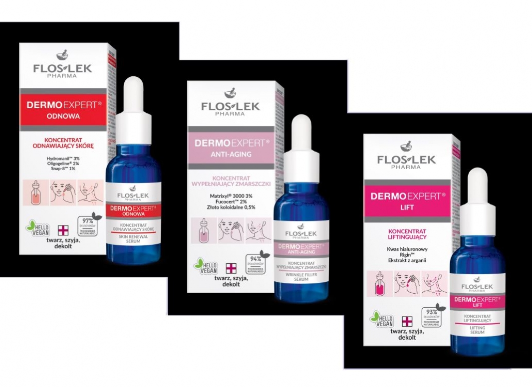 Sięgnij po koncentraty Dermo Expert marki Floslek Pharma. To specjalistyczna linia innowacyjnych dermokosmetyków przeznaczonych do pielęgnacji skóry dojrzałej z oznakami upływającego czasu, zmęczonej oraz wymagającej specjalistycznej kuracji. Ich nowoczesne receptury zostały oparte na silnie skoncentrowanych składnikach aktywnych o udokumentowanym działaniu. Cechuje je globalne, wielokierunkowe działanie nawilżające, wygładzające, odmładzające i regenerujące komórki naskórka. Przeznaczone są do każdego rodzaju skóry, w tym również do cery wrażliwej. Ich skuteczność i bezpieczeństwo są potwierdzone specjalistycznymi badaniami przeprowadzonymi w niezależnych laboratoriach badawczych.