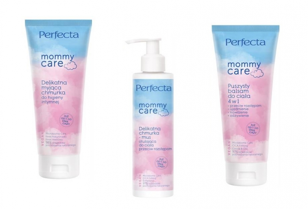 Perfecta Mommy Care z wielką czułością i zrozumieniem otoczy Cię opieką i troską. Wiemy, że teraz najważniejsze jest dla Ciebie zdrowie Twojego Maluszka. Dlatego pozwól nam zadbać o Ciebie, już od pierwszych chwil Twojej drogi przez macierzyństwo. Perfecta Mommy Care to linia do kompleksowej pielęgnacji w czasie ciąży, w skład której wchodzą: Delikatna myjąca chmurka do higieny intymnej, Puszysty balsam do ciała 4w1 oraz Delikatna chmurka-mus otulająca do ciała przeciw rozstępom.