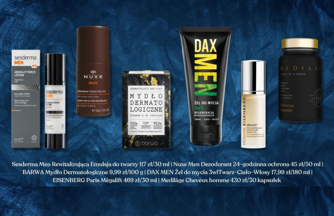 Dax Men Żel do mycia 3w1Twarz-Ciało-Włosy 17,99 zł/180 ml | Nuxe Men Dezodorant 24-godzinna ochrona 45 zł/50 ml | BARWA Mydło Dermatologiczne 9,99 zł/100 g.