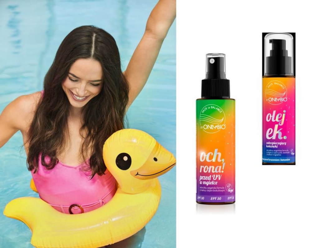 - Stosuj kosmetyki z ochronne z filtrami, np. Hair in Balance by ONLYBIO Ochrona przed UV w mgiełce (26,99 zł/ 100 ml) o słodkim zapachu soczystego arbuza. Mgiełka, to szybki sposób na zabezpieczenie pasm. Produkt dba o kondycję włosów, których struktura może być osłabiona przez szkodliwe promieniowanie. Dzięki SPF30 wyglądają one zdrowo, a ich kolor nie traci intensywności i głębi. Po kosmetyk sięgaj przed każdą ekspozycją na słońce, a w szczególności wtedy, gdy planujesz spędzić więcej czasu na świeżym powietrzu. Mocno wstrząśnij opakowanie. Rozpyl mgiełkę na włosy z odległości około 15 centymetrów od głowy, następnie przeczesz je szczotką lub grzebieniem, rozprowadzając produkt.