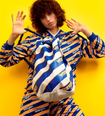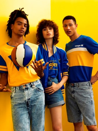 W kolekcji wiosna-lato 2018 Wrangler powraca do swojej wyraźnej estetyki z tamtych lat, z rozmachem bawiąc się odważnym zestawieniem koloru żółtego i niebieskiego oraz eksponując legendarne „W” w naprawdę dużym formacie i wielu miejscach.