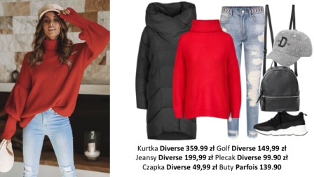 Aby uzyskać sportowy efekt, do czerwonego golfa dobieramy jeansowe spodnie z przetarciami. Odzienie wierzchnie i buty wybieramy w kolorze czarnym, a do całego zestawienia dorzucamy szarą czapkę z daszkiem. Tym razem, same potrzebne rzeczy z torebki przerzucamy do plecaka. Wedle uznania możemy też przełamać sporty look, dokładając biżuterię w postaci łańcuszka czy kolczyków.