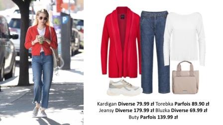 Podczas luźniejszego dnia, idealnie sprawdzi się połączenie najzwyklejszego białego longsleeve’u z czerwonym kardiganem i spodniami bez zwężanych nogawek. Na nogi zakładamy wygodne, jasne buty na płaskiej podeszwie, a do ręki chwytami większą, kremową torbę.