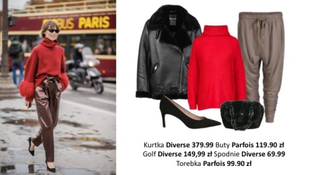 Tę bardziej elegancką wersję uzyskamy, stawiając na czerwony golf, beżowe chinosy i czarną, oversize’ową skórzaną kurtkę z elementem futerka. Akcesoria dobieramy pod kolorystykę naszej kurtki, wybieramy proste czarne szpilki i małą futrzaną torebkę.