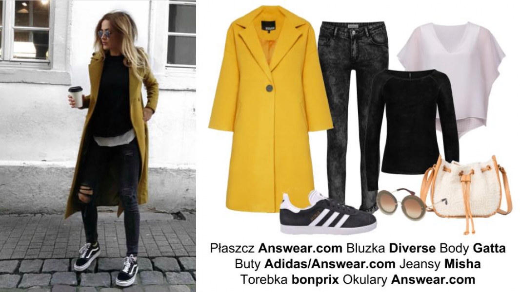 Która z nas nie ma w szafie swoich ulubionych jeansów? Jeśli nasz tryb życia na to pozwala, czasem możemy postawić właśnie na nie, razem z czarną koszulką, warstwami dobraną, z białym body i ponadczasowe adidasy. Naszej stylizacji dodadzą energii i szyku kanarkowy płaszcz i akcesoria, w tym wypadku torebka-miś oraz duże, okrągłe okulary przeciwsłoneczne.