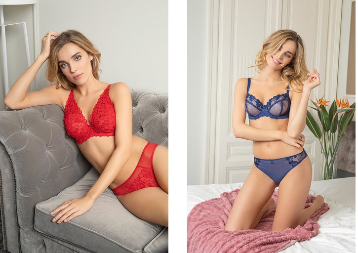 Jak prezentują się modele – ocenicie same. To, co na pewno warto o nich opowiedzieć to fakty, że w biustonoszu Naomi zastosowano innowacyjną miękką miseczkę z transparentnego haftu. Forma miseczki dzielona na trzy części zapewnia podtrzymanie średnim i dużym piersiom. Wewnątrz miseczki znajduje się dodatkowa warstwa szyfonu, która pełni funkcję zbierającą i podtrzymującą. W całości model Naomi stanowi doskonałą propozycję dla kobiet, które chcą zachować naturalny kształt biustu. Biustonosz dostępny jest w rozmiarach 65 E-G, 70 B-G, 75 B-G, 80 B-F. Do kompletu: bikini oraz brazyliany.