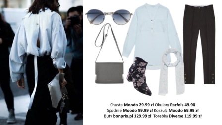 Klasyczną błękitną koszulę zestawiamy z czarnymi spodniami – obie części garderoby wybierzmy z dodatkiem subtelnej dekoracji, takiej jak ozdobne guziki. Wiosenny akcent wprowadzimy za pomocą Lenonek z kolorowymi szkłami i botków wypełnionych po brzegi kwiecistymi wzorami.