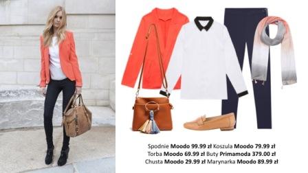 Wyróżniony przez Instytut Pantone, uwielbiamy przez blogerki z całego świata – mowa oczywiście o odcieniu Living Coral. Intensywny koralowy odcień nada całkiem nowego znaczenia typowo casualowej stylizacji złożonej z białej koszuli z kołnierzykiem i granatowych spodni.