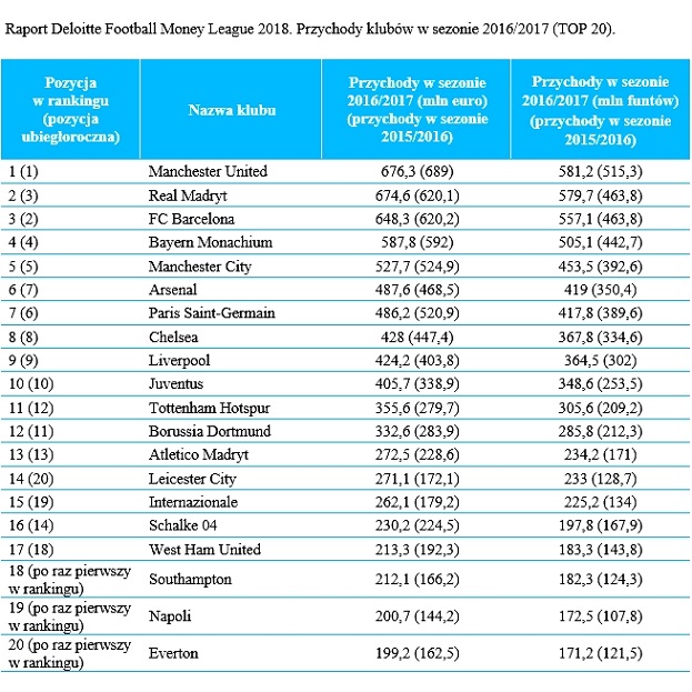 Manchester United ponownie jest klubem piłkarskim o największych przychodach na świecie. W sezonie 2016/2017 przychody angielskiego giganta wyniosły 676 mln euro. O jego zwycięstwie nad drugim w zestawieniu Realem Madryt zdecydował triumf w Lidze Europejskiej UEFA. Trzecie miejsce w rankingu zajęła FC Barcelona. Przychody dwudziestki największych futbolowych drużyn wyniosły 7,9 mld euro, o sześć procent więcej niż rok wcześniej. To najważniejsze wnioski z 21. edycji raportu „Football Money League”, przygotowanego przez firmę doradczą Deloitte.