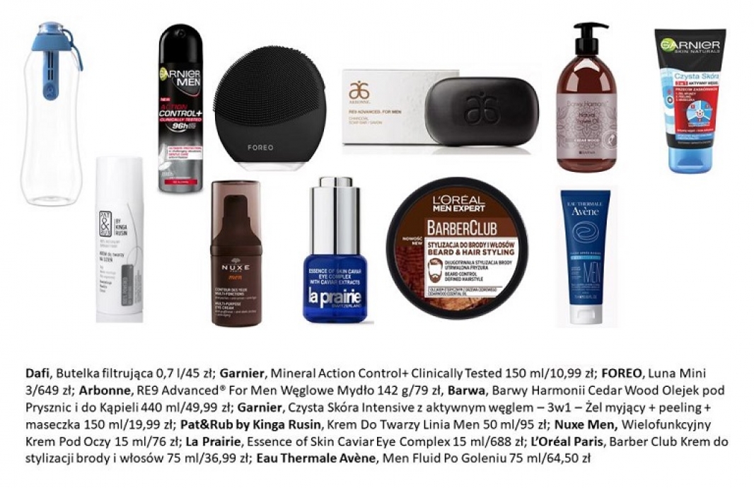 Polecamy: Garnier Czysta Skóra Intensive z aktywnym węglem – 3w1 – Żel myjący + peeling + maseczka 150 ml/19,99 zł; Pat&Rub by Kinga Rusin, Krem Do Twarzy Linia Men 50 ml/95 zł; Nuxe Men – Wielofunkcyjny Krem Pod Oczy 15 ml/76 zł; La Prairie, Essence of Skin Caviar Eye Complex 15 ml/688 zł.