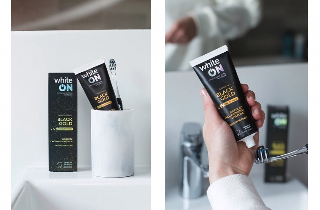 Przyszłość wybielania zębów bez ryzyka uszkodzeń szkliwa whiteON Black Gold 22K złoto z aktywnym węglem