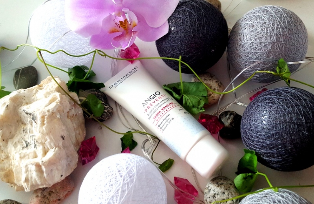 Dermedic Angio Preventi - bogaty krem ochronny SPF15 maskujący rumień, jak sama nazwa wskazuje zalecany jest osobom ze skórą wrażliwą, skłonną do powstawania rumienia. Dermokosmetyk zastosowanie znajdzie w przypadku skóry z popękanymi naczynkami, plamami pigmentacyjnymi i objawami trądziku różowatego. Przyniesie ukojenie w pieczeniu i swędzeniu skóry. Dzięki hipoalergicznym składnikom aktywnym może być używany przez osoby ze skórą skłonną do podrażnień i stanów zapalnych. Może być używany przez cały rok, dla mnie jest idealny w chłodniejsze letnie dni, jesienią oraz wiosną.