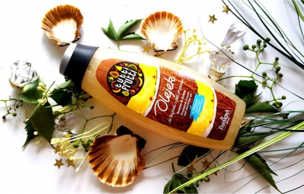 Olejek może być używany też jak płyn do kąpieli, po wlaniu go do wanny widzimy, że bardzo dobrze łączy się w wodą i przyjemnie się pieni, a piana jest dość sztywna. Zapach wody jest bardzo słodki z nutą ananasa. Kosmetyk dobrze myje ciało, pozostawia na nim miły zapach i zawiera wiele składników aktywnych.